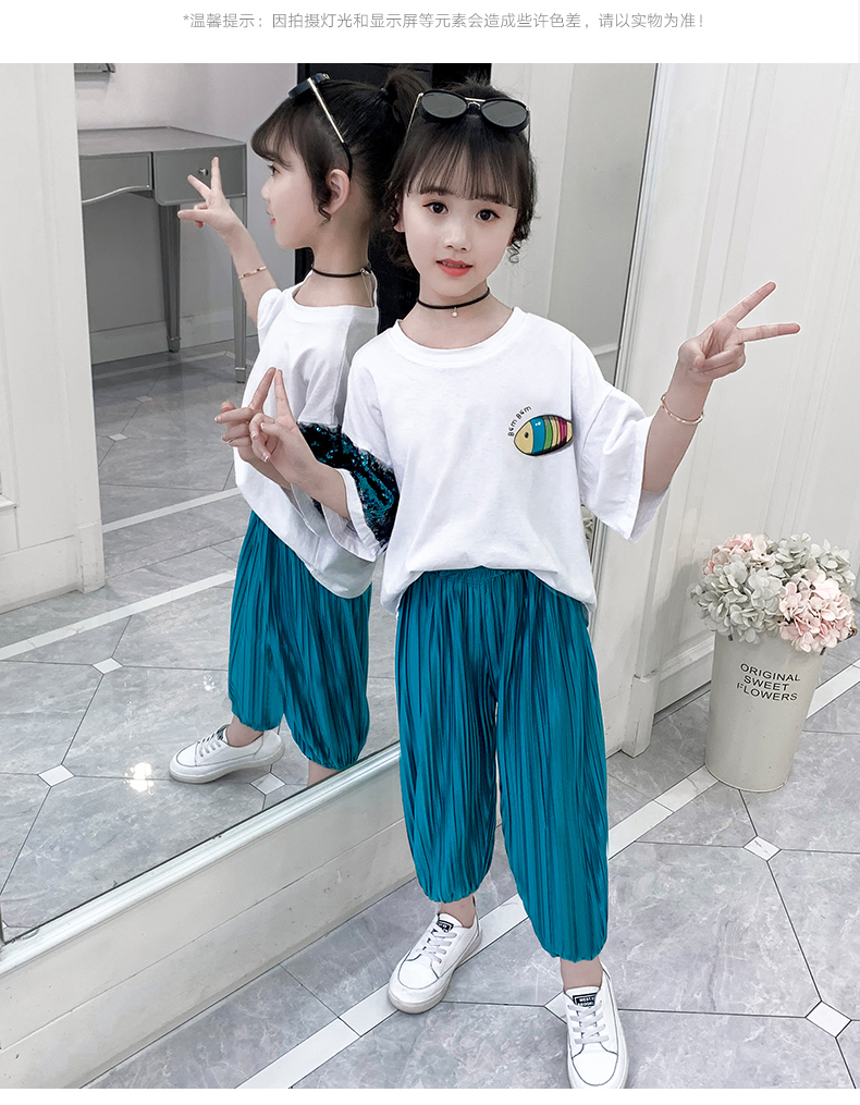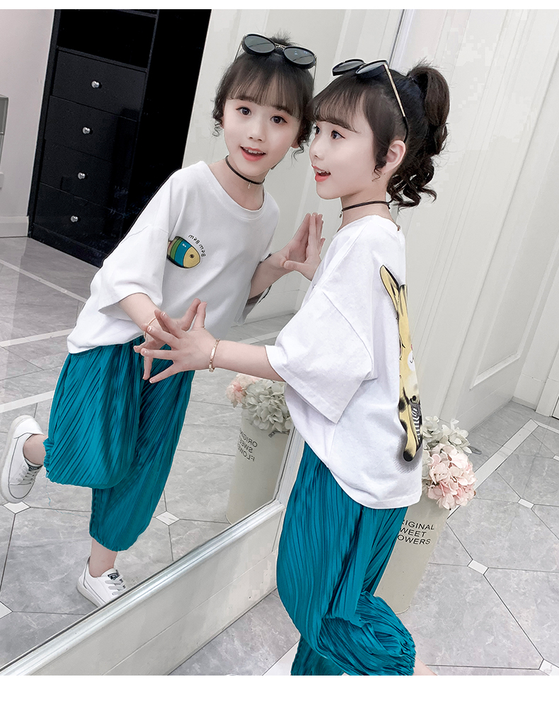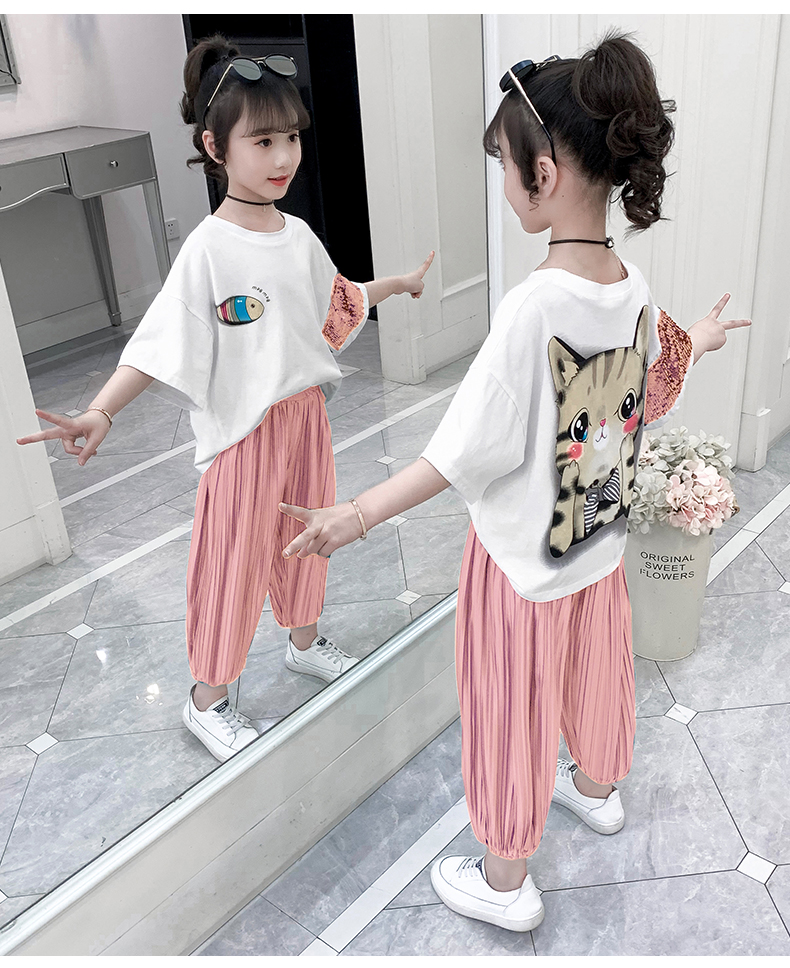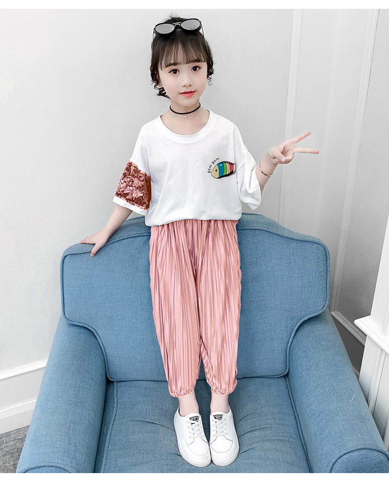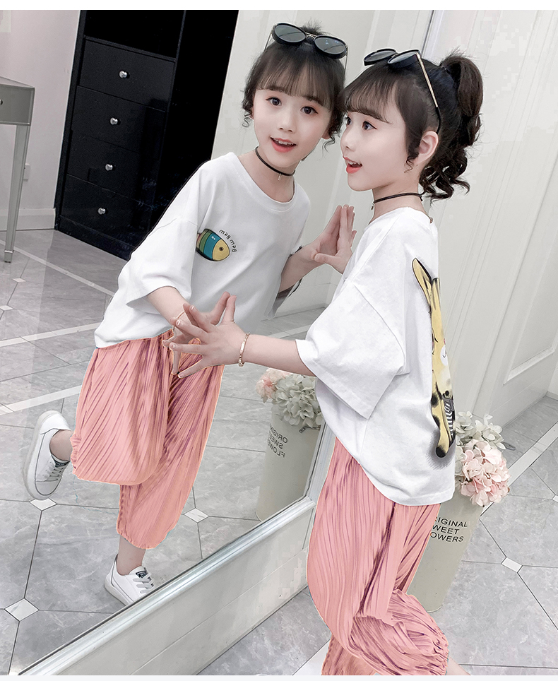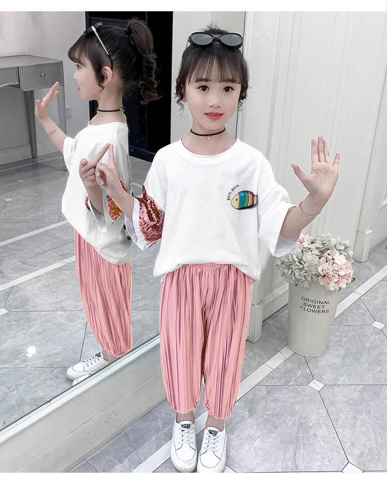 浪莎童裝女童夏裝中大童洋氣t恤純棉短袖套裝兒童寬松冰絲防蚊褲