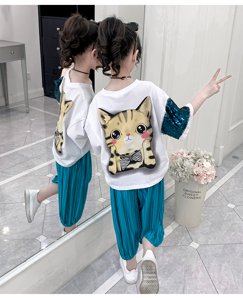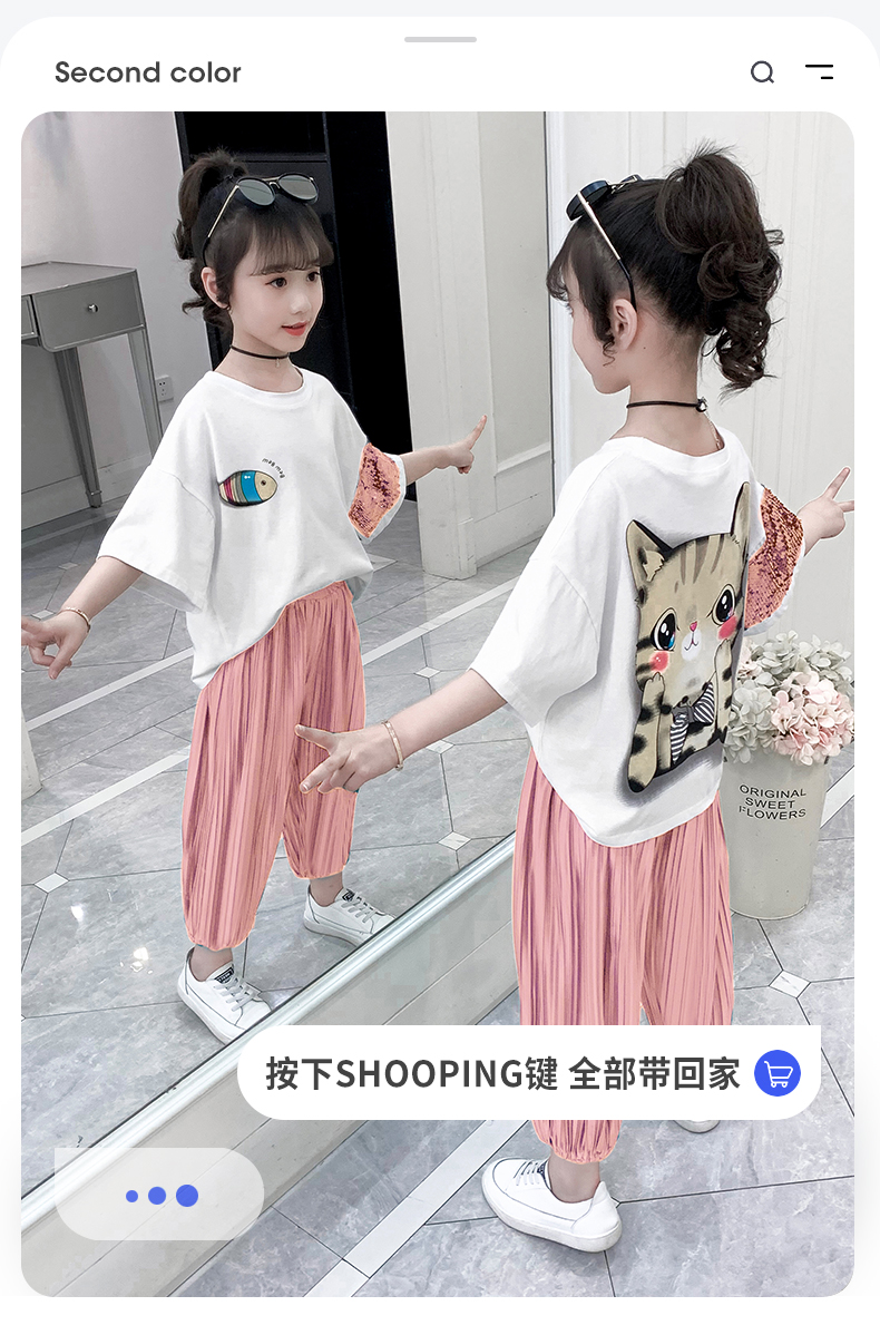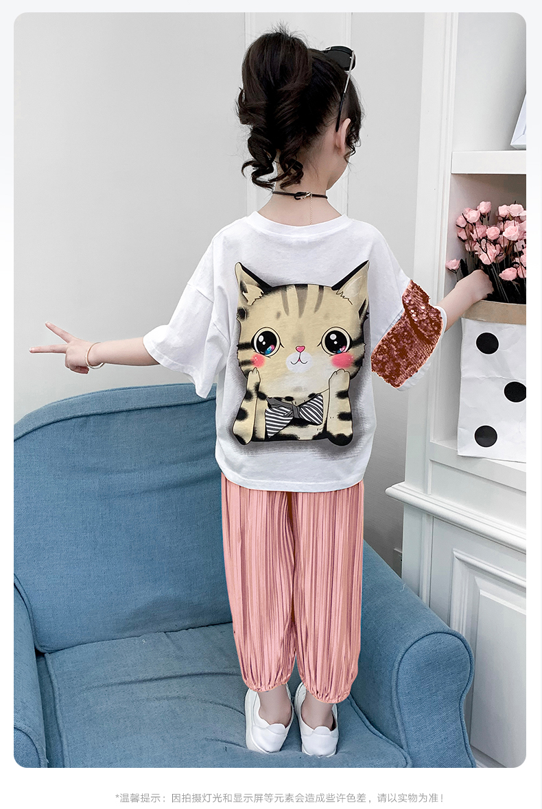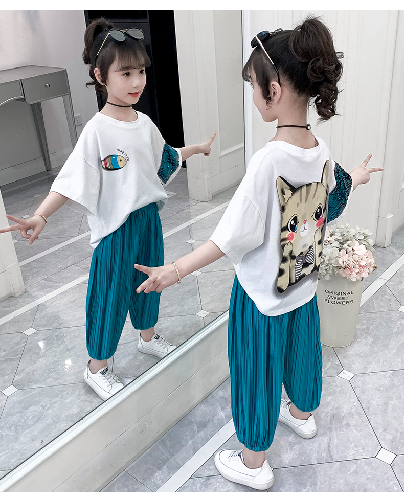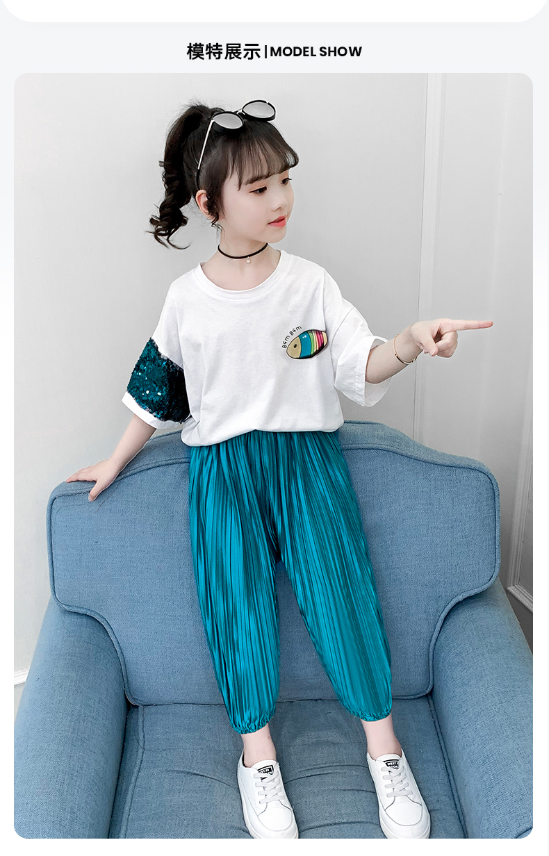 浪莎童裝女童夏裝中大童洋氣t恤純棉短袖套裝兒童寬松冰絲防蚊褲
