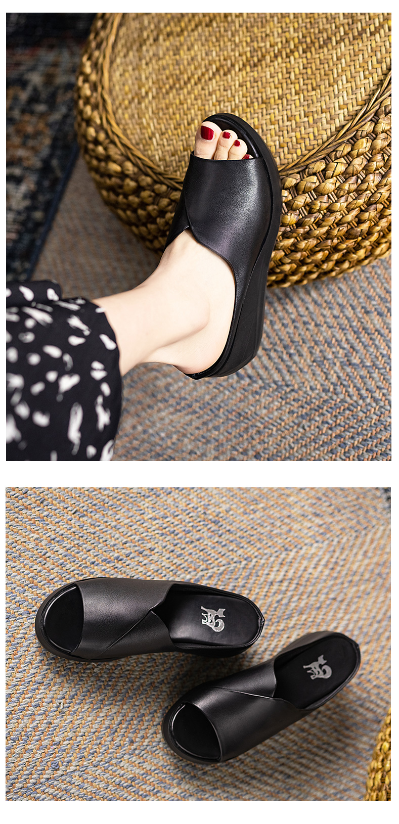 浪莎坡跟涼拖女外穿2021春新款夏天時尚高跟真皮懶人厚底魚嘴拖鞋